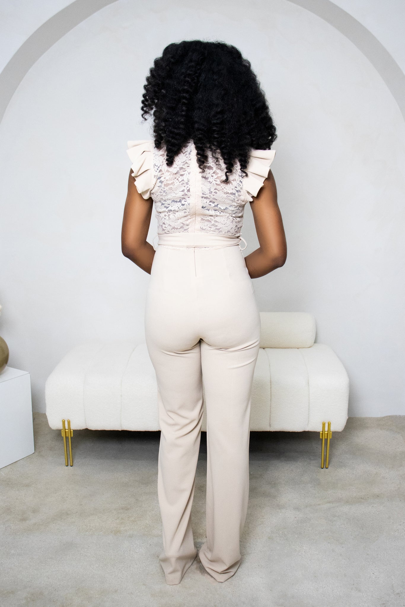 LACE AND CROCHET TOP JUMPSUIT WITH FLARE CAP SLEEVE.