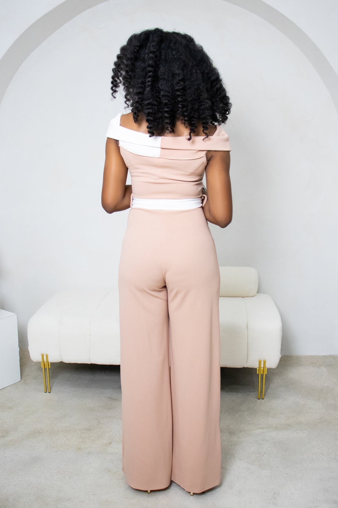 BELTED OFF THE SHOULDER CONTRAST JUMPSUIT
